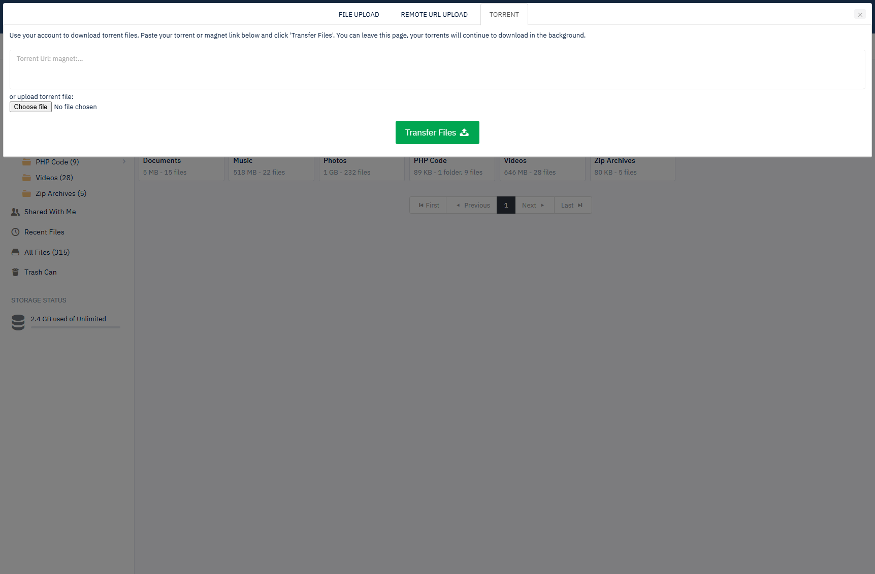 A new tab on the file uploader popup lets users add torrents via .torrent files or magnet links.