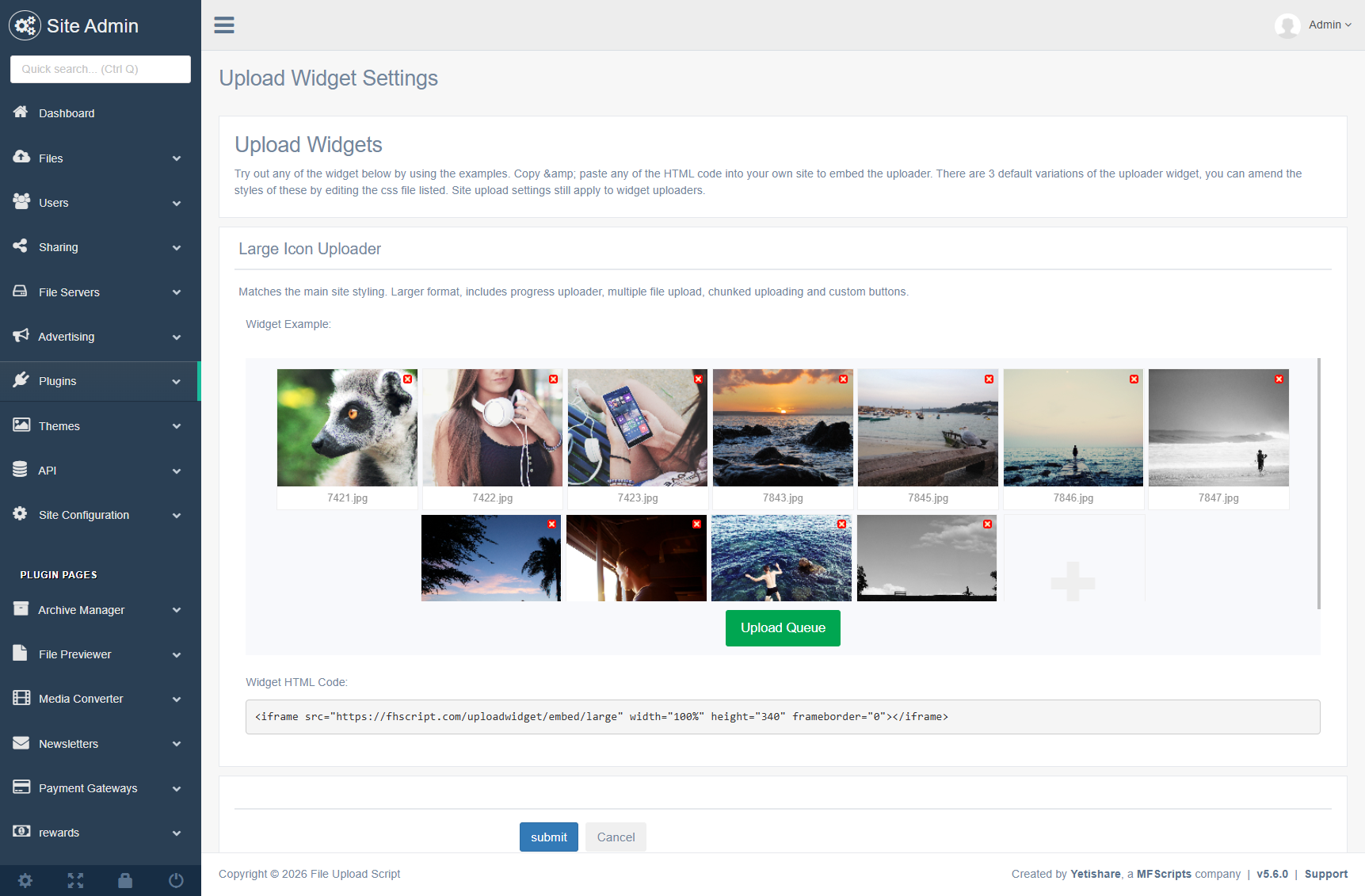 Large icon uploader matches main site styling with progress and chunked uploads; medium uses smaller icons; minimal is a compact starting point for customising.