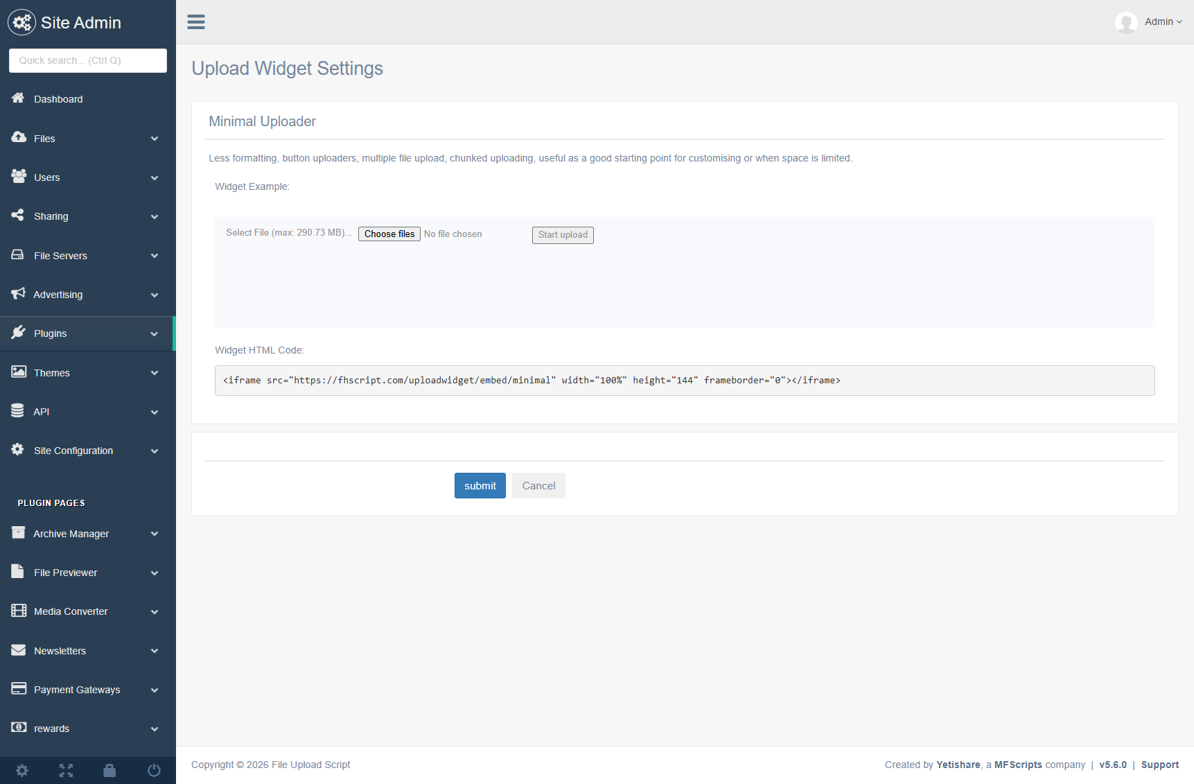 Drop the embed code into any HTML page; the widget handles uploads via your Yetishare site.
