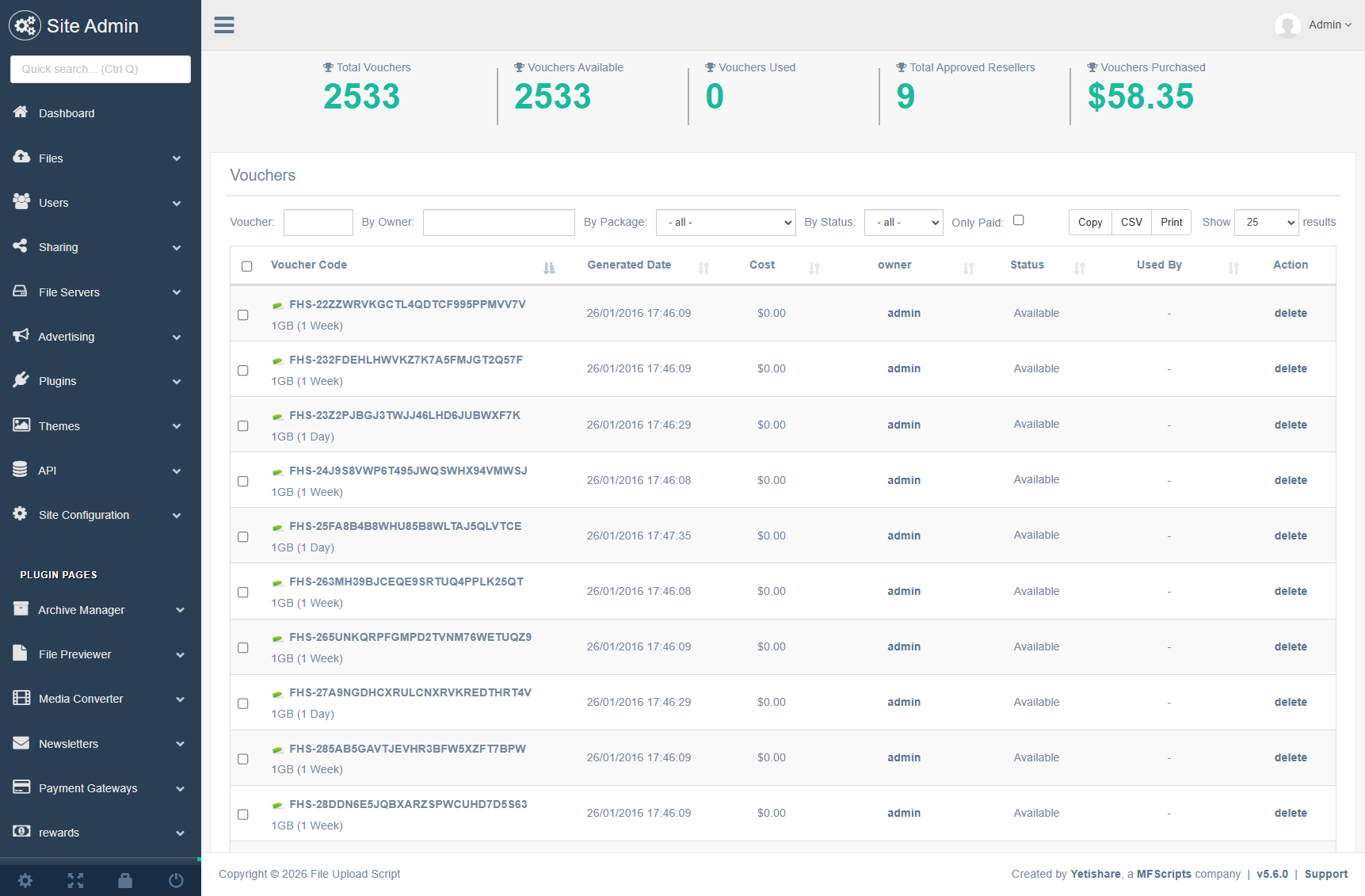 Cancel one or more vouchers; optionally manually override reseller balance; generate vouchers via admin for free by package, period and amount.