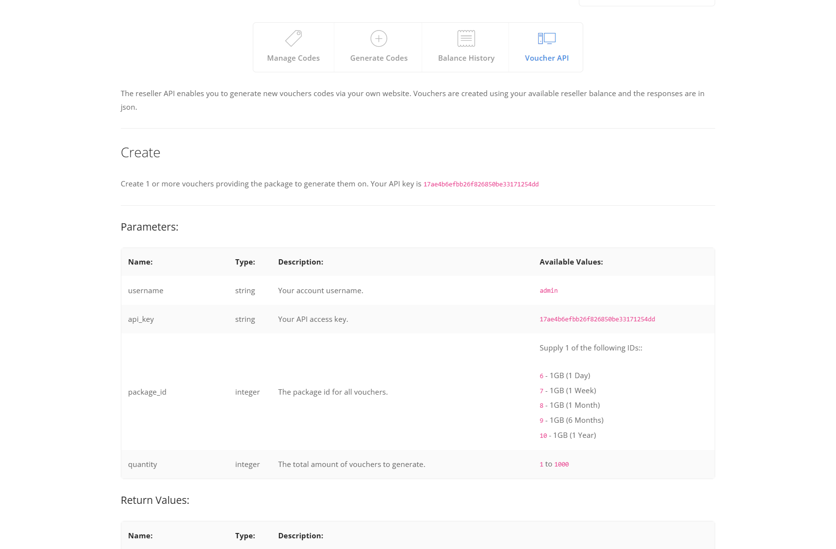 API access to create one or more vouchers externally from the site using the reseller's existing account balance.