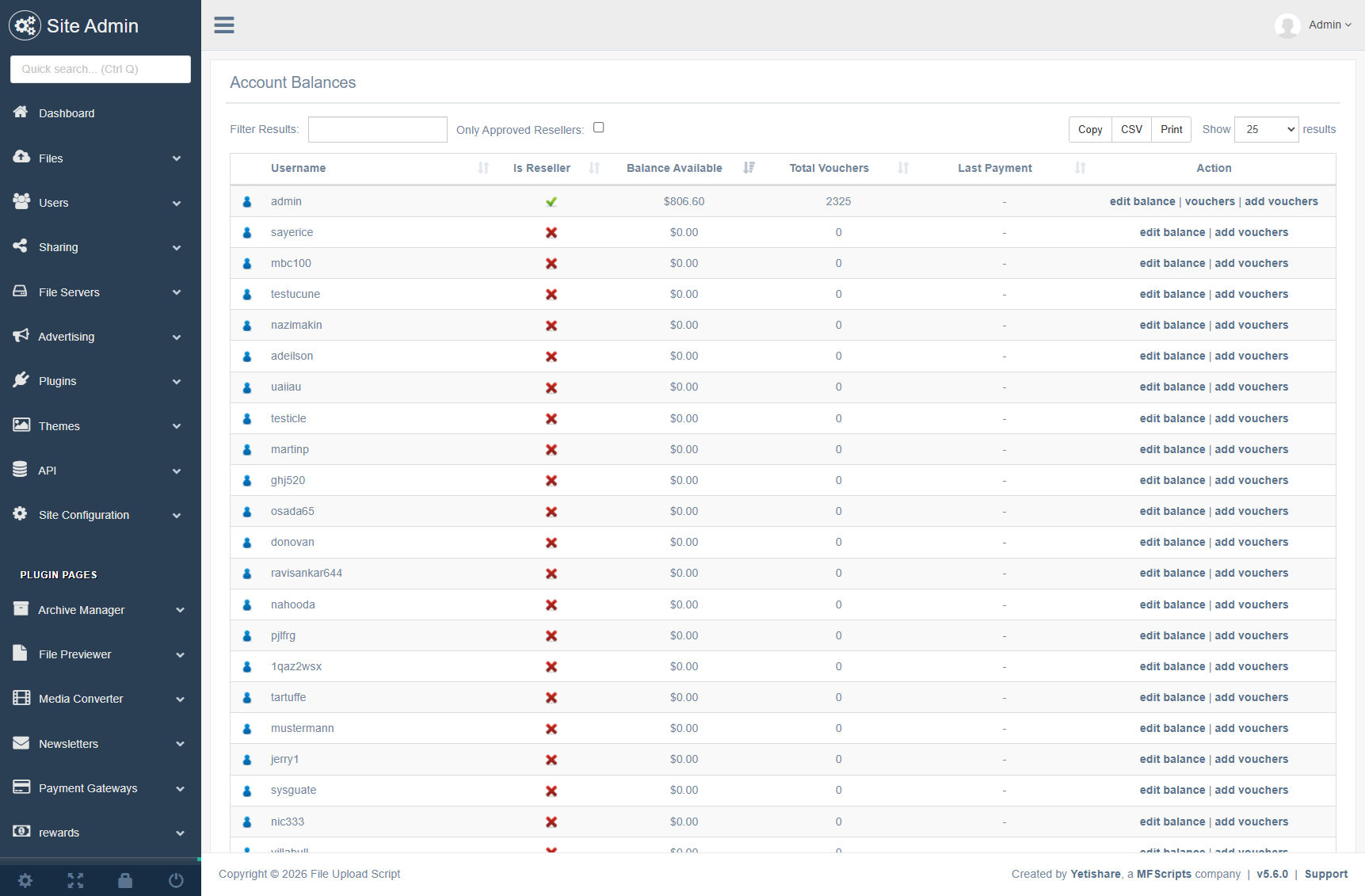 Cancel one or more vouchers; optionally manually override reseller balance; generate vouchers via admin for free by package, period and amount.