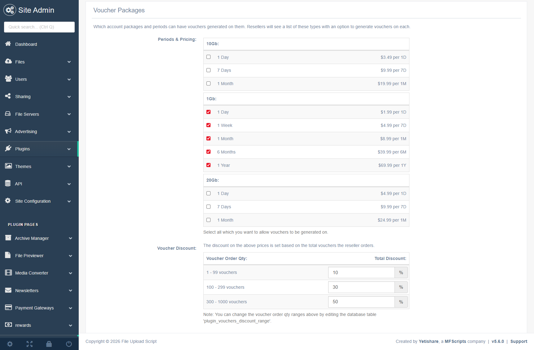 Enable/disable plugin, voucher length, custom structure, max vouchers per user, package access, volume discounts, top-up limits and more.